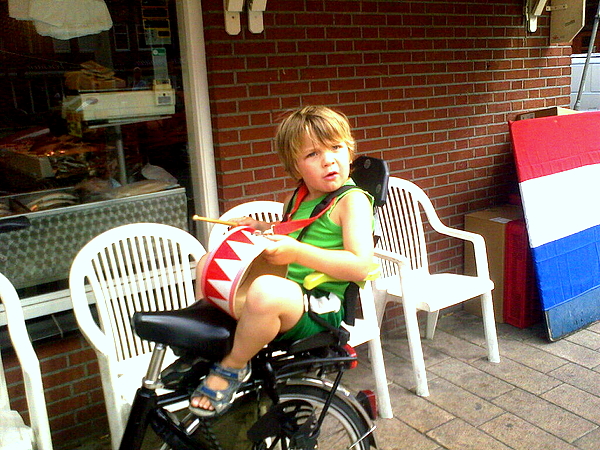 Ik loop naar buiten, in mijn hand een witte plastic tas. Ik hoor getrommel en kijk naar links. Daar zit hij, achterop. Zijn moeder is snel even naar binnen gelopen: ‘Vier lekkerbekjes alstublieft’, ondertussen houdt ze haar zoon in de gaten. Eerst valt mijn oog op zijn blikken trommel, het heeft zo’n zelfde rood-witte circus rand. Pas daarna zie ik zijn gezicht. Hij is het, ik weet het zeker… Oskar Matzerath. Hij is wat dikker geworden en zijn haar wat langer. Maar hij is nog steeds klein, nog steeds het eeuwige kind. Oskarchen slaat wild met zijn stokken op het vel van zijn Blechtrommel. Hij heeft plezier. Als ik een foto van hem maak, draait hij met een ruk zijn gezicht naar me toe. Zijn ogen kijken me woest aan… ik druk af en glimlach naar hem. Hij lacht terug en trommelt trots verder.