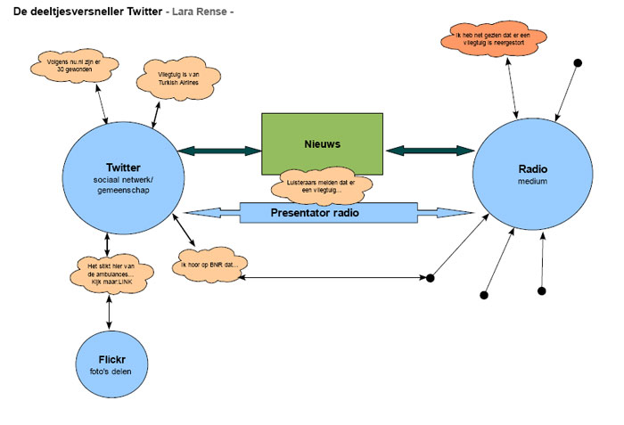 Maar in de aard van het netwerk zit ook een risico. Dat zie je terug in het schema. Twitteren kan overal, vanaf een mobiele telefoon of computer. En het is simpel en snel, razendsnel. De netwerksite is zo opgezet dat binnen enkele seconden gebruikers elkaar kunnen volgen en tweets kunnen lezen. Op deze manier ontstaan oneindige vertakkingen, connecties tussen bekenden en onbekenden. Op dit mondiale dorpsplein gaan berichten van oor tot oor en kunnen de bewoners zelf steeds iets melden en toevoegen. Vandaar de term deeltjesversneller. Geen magnetische velden en elementaire deeltjes, maar miljoenen twitteraars wereldwijd en berichten van maximaal 140 tekens. Nog niets aan de hand, toch? Echter, op dat mondiale dorpsplein gaan ook berichten rond die niet kloppen. Er wordt heel wat geretweet (doorgestuurd) op het netwerk, dus ook dat soort onjuiste informatie reist in rap tempo van de ene naar de andere twitteraar. Een onjuist bericht over bijvoorbeeld het aantal doden bij de Schiphol crash kan zo een eigen leven leiden op Twitter. En daar moet je dus mee oppassen als journalist. Een simpele controle van feiten en vermelding van bronnen kan al een hoop leed besparen.